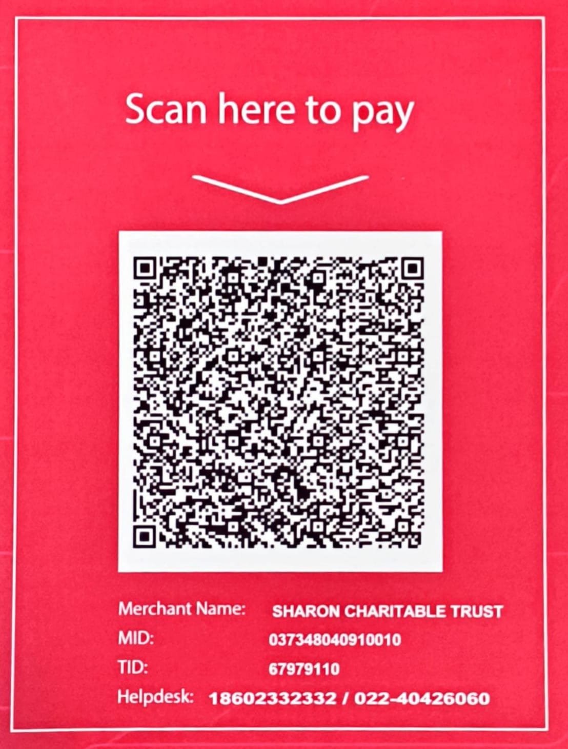 Name : Sharon Charitable Trust Bank account Number : 925020010085730 Bank Name: Axis Bank